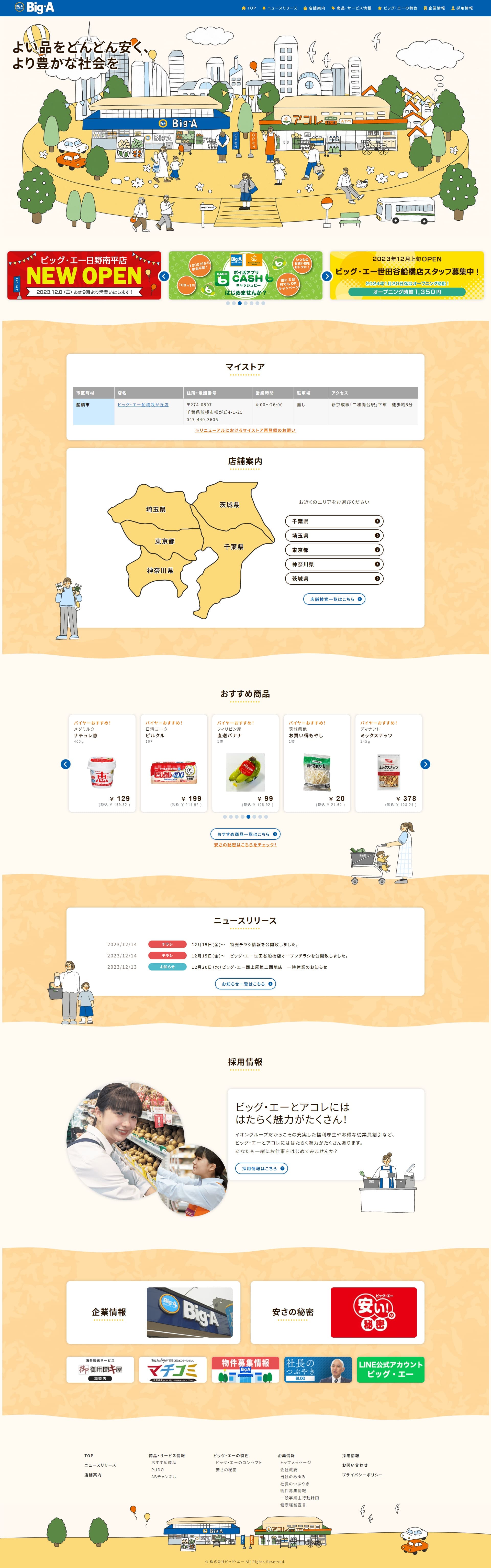 株式会社ビッグ・エー様とアコレ株式会社様の経営統合に伴ったホームページリニューアルを担当いたしました。低価格な商品で地域の方々に寄り添っていきたいというお客様の思いが伝わるようにサイト全体に丸みを帯びたやわらかいスタイルを持たせています。