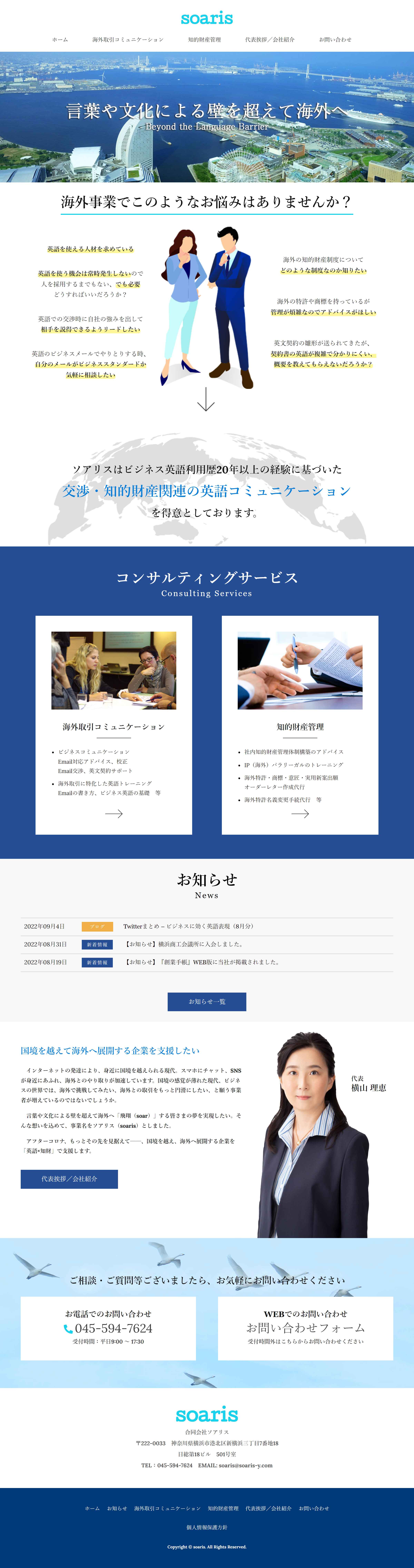 神奈川県横浜市で英語研修・知的財産管理を行うコンサルティング会社様の立ち上げに伴い、新規のホームページ制作を担当いたしました。「横浜」「海外コンサルティング」「会社名の由来である飛翔(soar)」ということをキーワードにデザインをしています。下層ページでは来社されるお客様が多いということで、スムーズにお客様が到着できるよう会社までの道のりをポイントポイントで実際の画像を交えつつ詳細に掲載するなど実際にホームページを使うユーザーの視点に沿った制作を心掛けました。